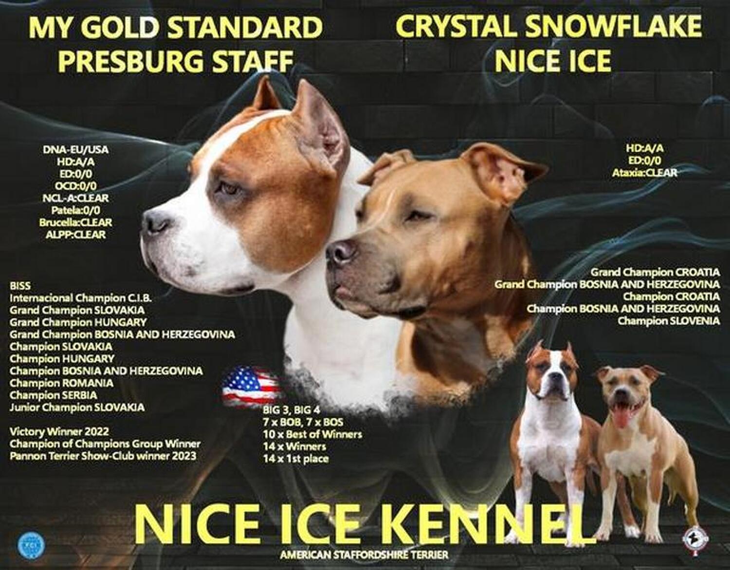 BISS, International Champion, Grand CH of Slovakia. Grand CH of Hungary. Grand CH of Bosnia and Herzegovina, CH of Slovakia. CH of Hungary, CH of Bosnia and Herzegovina, CH of Romania, CH of Serbia, J-CH of Slovakia